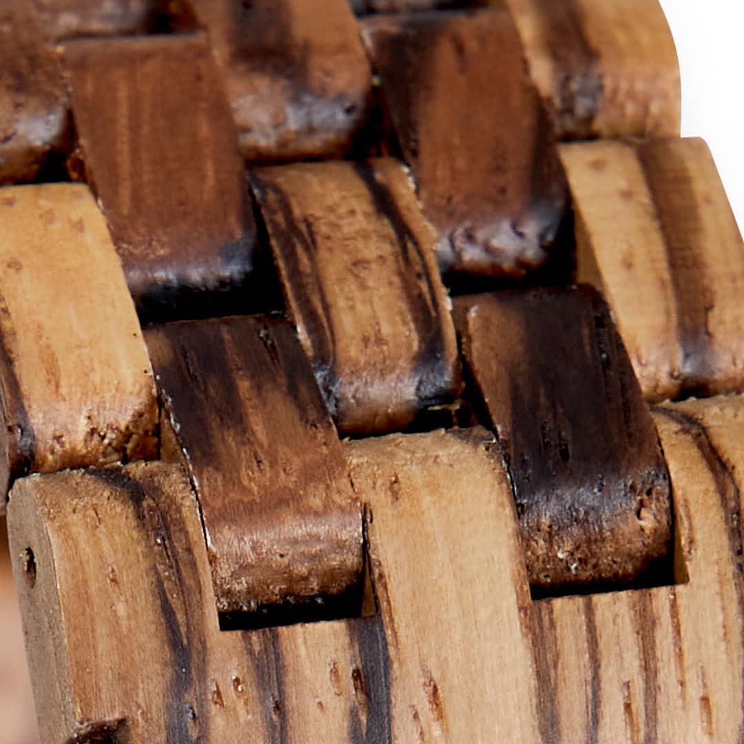 Zebrawood originates from the Microberlinia brazzavillensis tree of tropical West Africa. Specifically the dense rainforests of Cameroon, Gabon, and Nigeria. The tree faces threats from deforestation and habitat loss due to logging and agricultural expansion. This is why we only use Zebrawood reclaimed from furniture offcuts and upcycled into our natural watches.