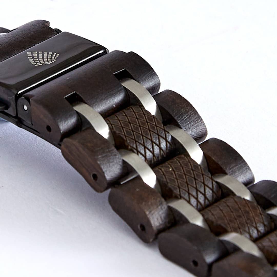 Durable Design: The black Ebony wood textured links are intertwined with stainless steel links for added durability. The simplicity of the colour palette and durability of the strap makes The Ebony the perfect sustainable accessory for your wearable tech in both professional and social settings.