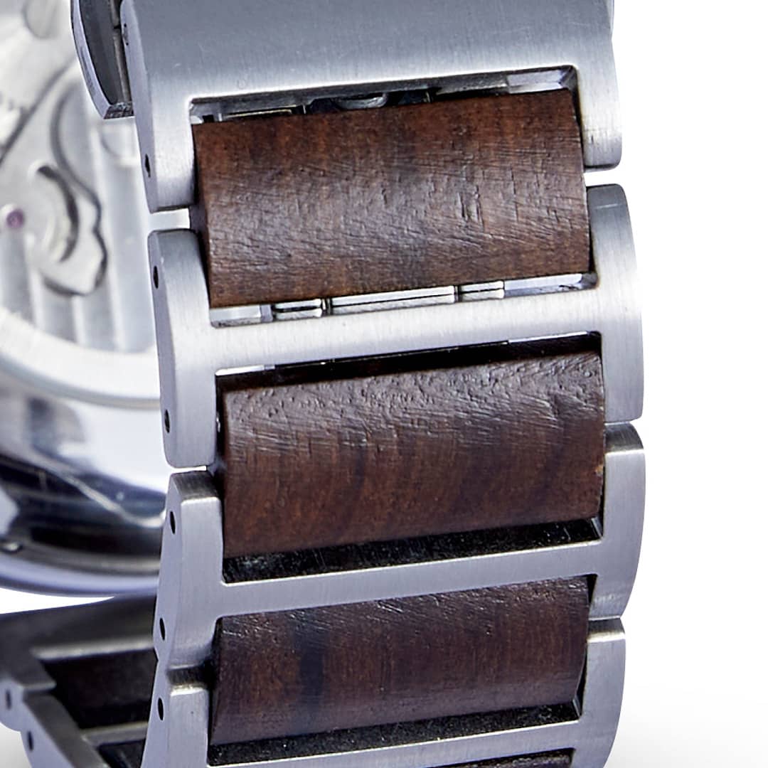 Modern Construction: The Banyan is a handmade eco-friendly watch for men, crafted from recycled Chacate Preto wood furniture. Its durability is enhanced with spring-loaded pins and reinforced stainless steel connectors, used throughout the watch band. These contribute to the superior quality of this wooden watch