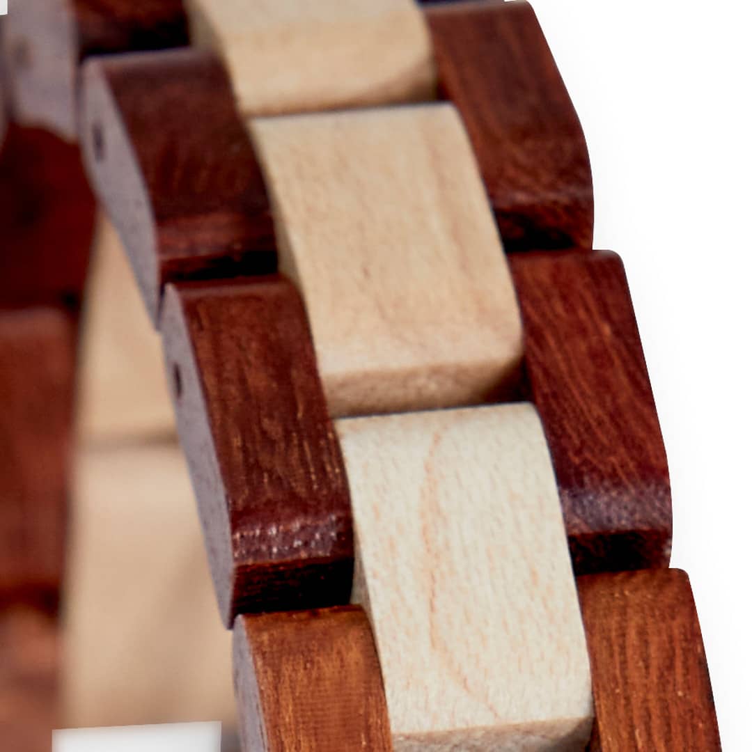 Hard maple, particularly from North America, is known for its pale colour; whereas Red Sandalwood is renowned for its rich reddish hue, contrasting one another beautifully in this natural watch.
