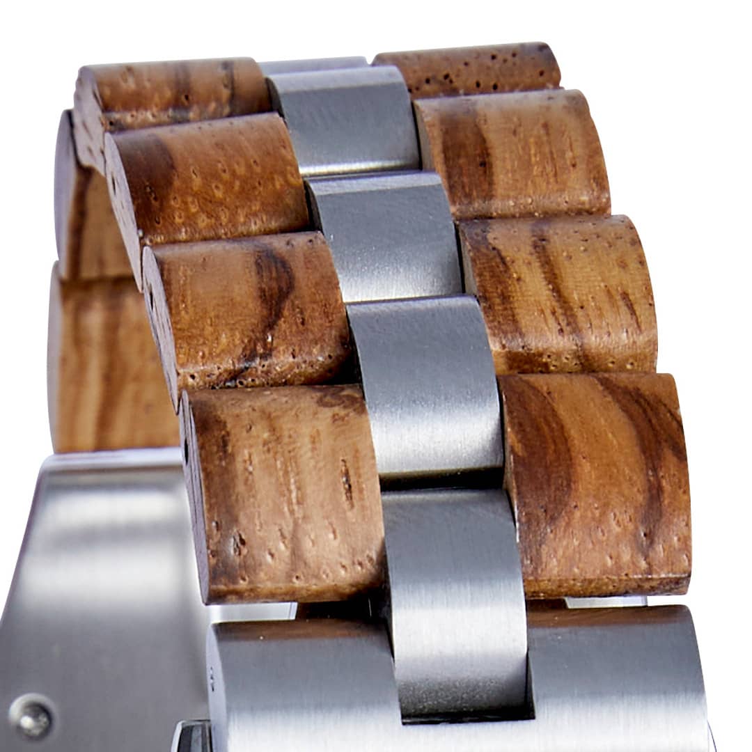 Contrasting Style: The sandalwood showcases a unique colour combination of the brushed steel links, bezel, and back; alongside the natural light brown hues of Zebrawood.  Every Sandalwood watch is one-of-a-kind, featuring grain patterns unique to the piece of wood it was carved from.